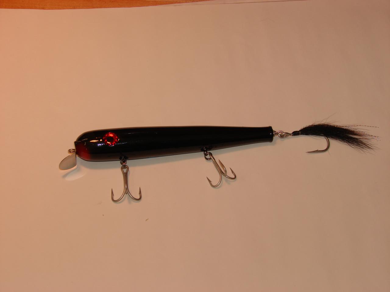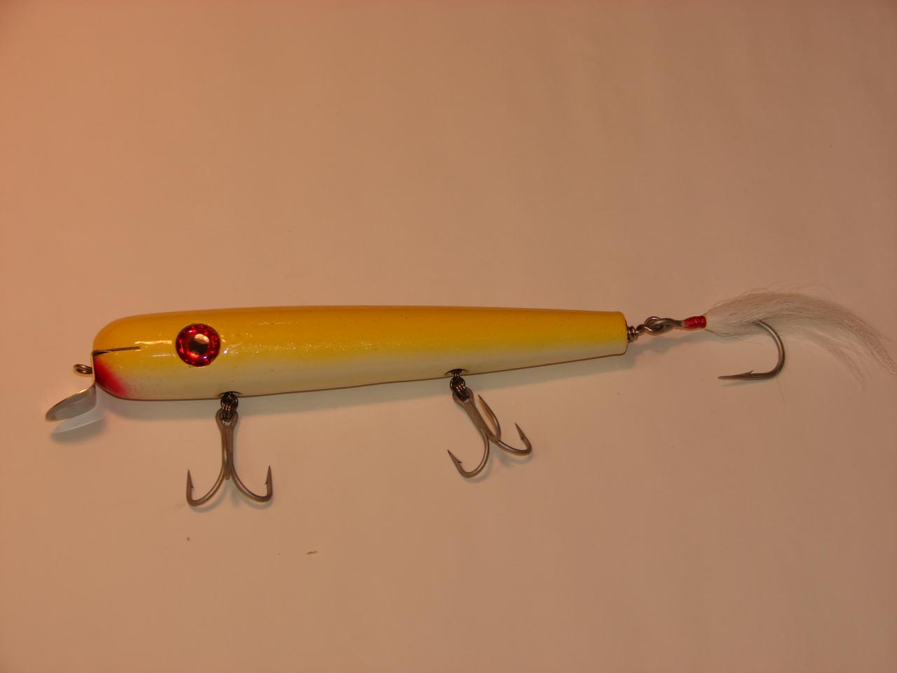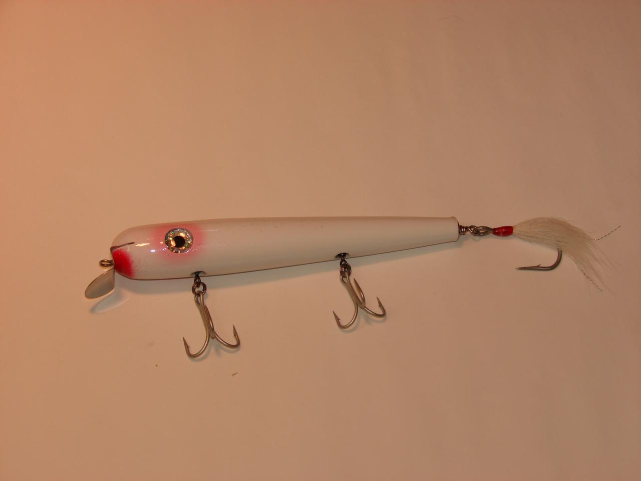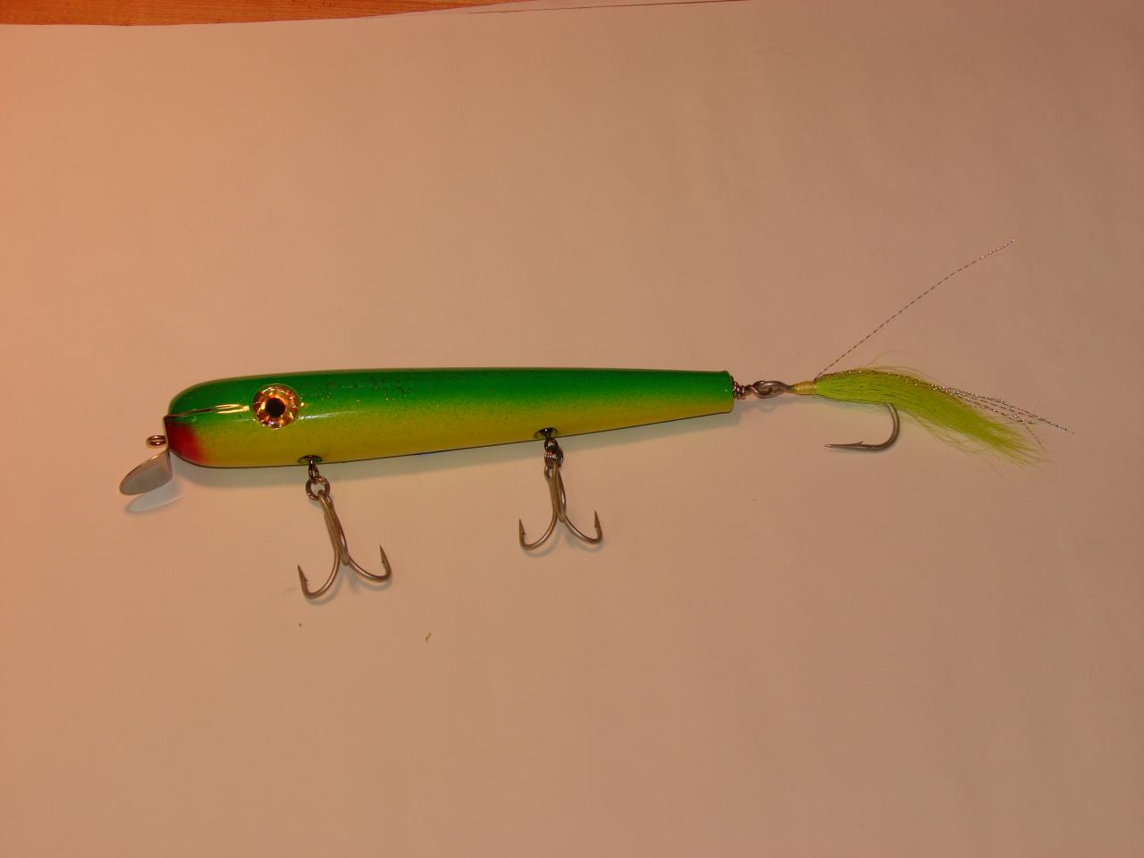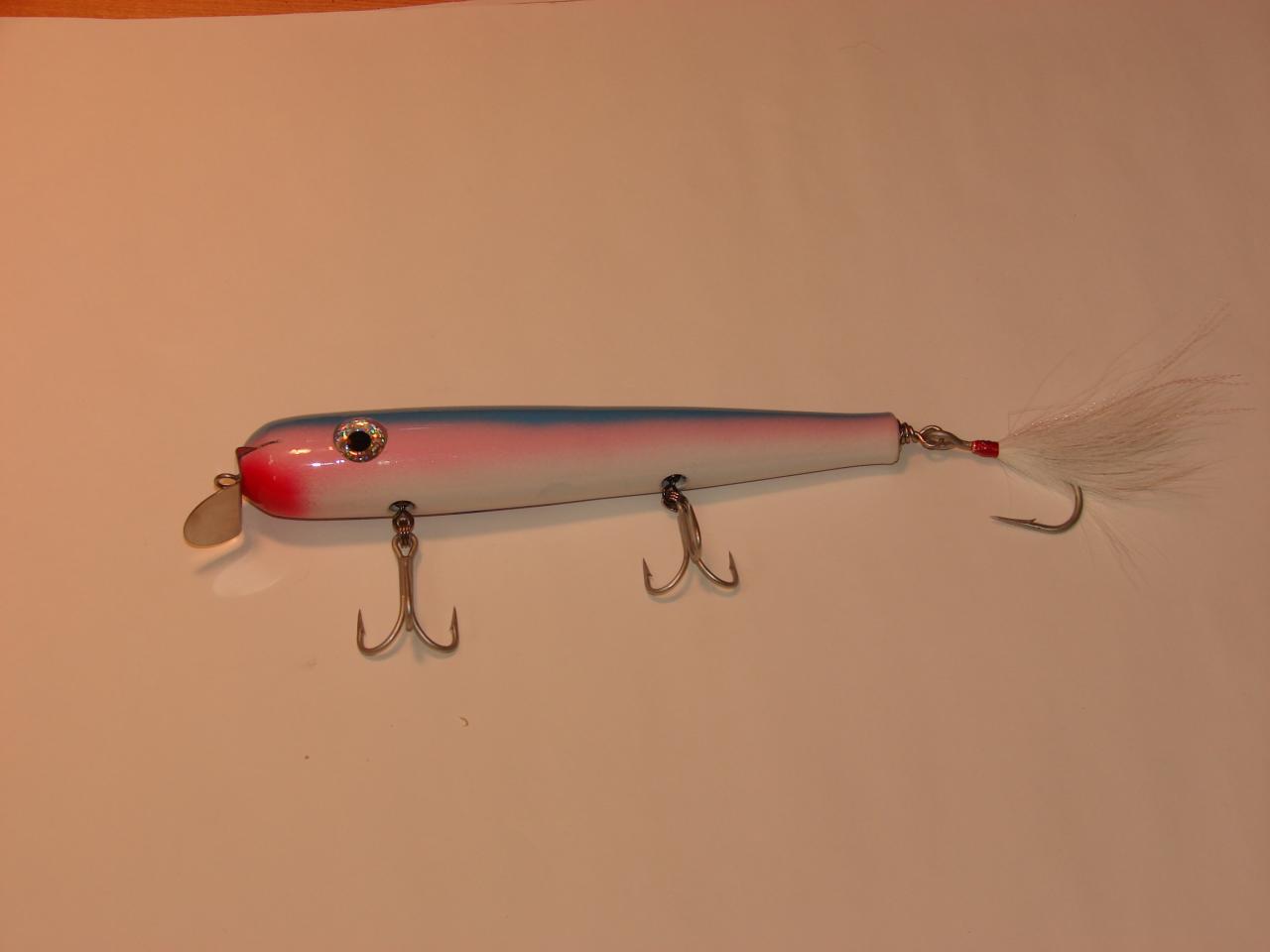 This is a long, big profile swimmer. They have an average weight of 3 ounces** and an average body length of 7 1/2 inches. They dig in and swim with a tight wiggle. This plug was designed for casting and jetty drifting, but is also successful for trolling. They are fitted with a 4/0 VMC 4X treble for a front belly hook, a 3/0 VMC 4X treble for the rear belly and a dressed 6/0 VMC 4X Siwash for the tail hook. They are available in all colors shown as well as many other stock and custom colors.